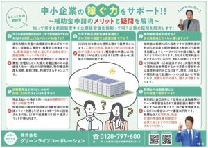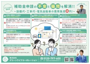 グリーンライフコーポレーションの『エネルギーチェンジ光熱費 0円 革命!!電気軽自動車プレゼント企画』では、2024年度国、県、グリーン ライフ合わせて最大249. 1万円の補助金を活用することにより各ご家庭、各事業所様に 今回ご紹 介する設備費用を今の家計 に新たに 負担を全くかけ る事なく実質負担0 円(5つの条件付き)で導入出来る画期的、革新的な近未来 お客様の生活のコストダウンをお手伝いさせ て頂くための、 グリーンライフ顧客様への恩返しプランです!